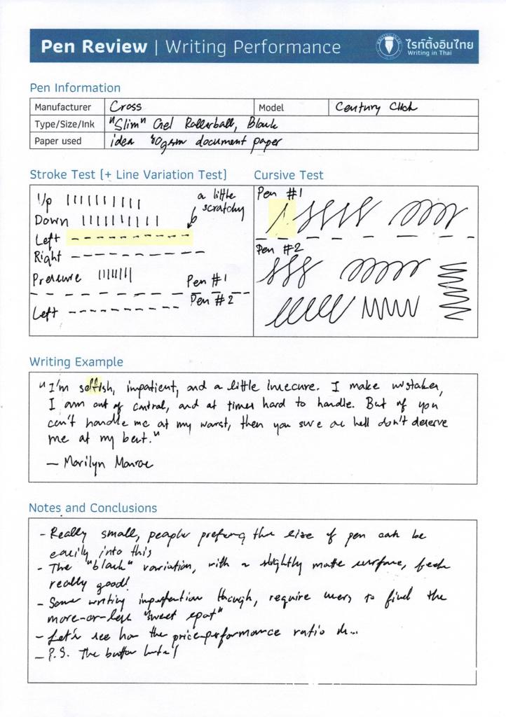 สำหรับ Cross Century II ที่ทีมงานได้รับ ต้องถือว่าเขียนได้ดีตามพิมพ์นิยมของปากกา Cross และไม่ทำให้ผิดหวังแต่อย่างใด การเขียนทำได้ดีในทุกทิศทาง